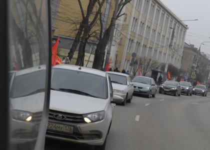 От памятника Славы по магистральным улицам города коммунисты и представители лево-патриотического фронта Воронежской области проехали с алыми знамёнами, напомнив землякам о нашей Родине - Союзе Советских Социалистических Республик и истинном выборе советского народа, о необходимости сплачиваться и бороться за свои интересы против засилья капитала.