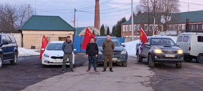 Автопробег, организованный при поддержке местного отделения КПРФ, прошел по памятным местам округа. Колонна автомобилей с красной символикой и флагами партии.