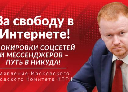 Московский городской комитет КПРФ по итогам V совместного Пленума МГК и КРК МГО КПРФ выступил с заявлением против блокировок в мессенджерах и социальных сетях – его зачитал секретарь МГК КПРФ по идеологии и депутат Госдумы Д.А. Парфенов.