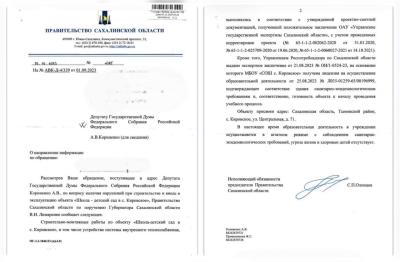 Депутат А.Корниенко продолжает добиваться внимания к состоянию школы, реагируя на обращения сахалинцев о неготовности объекта к эксплуатации и нарушениях, допущенных при строительстве. Просит принять меры прокурорского реагирования. Летом 2024 руководитель Следственного управления СК РФ по Сахалинской области Б.Б. Базаров отвечает депутату: “...установлено, что в производстве Тымовского межрайонного следственного отдела находится уголовное дело № 12402640021000011, возбужденное 13.05.2024 по признакам преступления ч.1. ст. 285 о ненадлежащем исполнении обязанностей должностными лицами… доводы будут проверены в рамках расследования…”