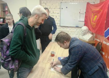 В роли ведущего и модератора круглого стола выступил саратовский комсомолец, участник СВО и волонтёр Сергей ЗАГУРНЫЙ, продемонстрировавший видеоролик, посвящённый погибшим на фронте солдатам и офицерам — членам комсомола и КПРФ, а также рассказавший о налаживании и устройстве гуманитарного производства.