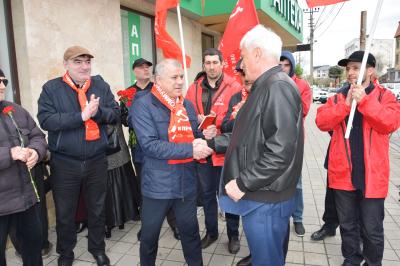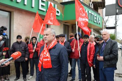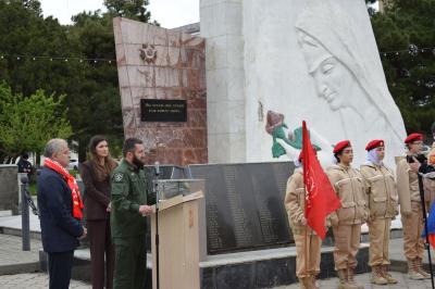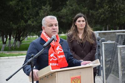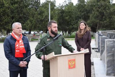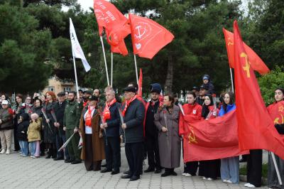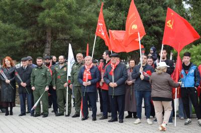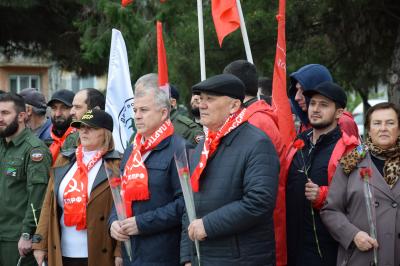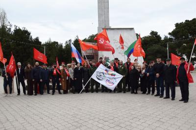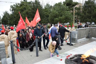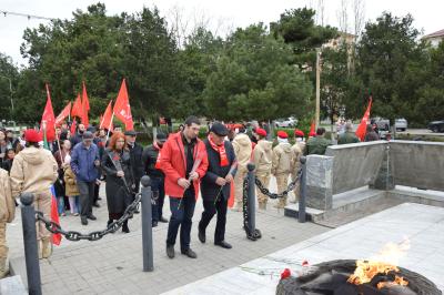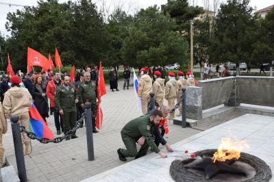 Затем автоколонна направилась в город Каспийск. В городском сквере, у памятника Воинам-Каспийчанам, погибшим в годы Великой Отечественной войны, участников автопробега встретили члены Каспийского городского отделения КПРФ во главе с первым секретарём Азой Алиевой.