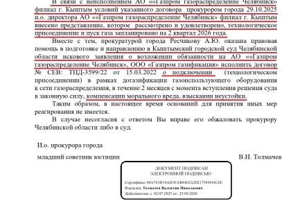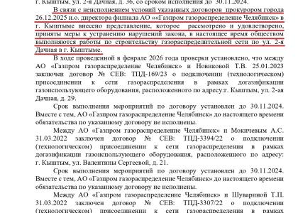 Только после того, как КПРФ направила обращение, прокуратурой была проведена проверка, в результате которой было установлено неисполнение договоров, а в отношение руководства АО «Газпром газораспределение Челябинск» в Кыштыме было вынесено представление. В итоге в настоящее время выполняются работы по строительству газораспределительной сети по улице 2-я Дачная, а технологическое присоединение и пуск газа в дома запланированы на 2 квартал 2026 года.