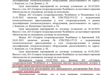 В январе 2026 года в приёмную Челябинского обкома КПРФ поступило коллективное обращение от жителей города Кыштыма. Граждане просили оказать содействие в решении острой проблемы – подключению домовладений к сети газораспределения. Указанную работу ресурсоснабжающая организация должна была выполнить в рамках догазификации. Об этой ситуации жители сообщали в своём видеообращении к Президенту России ещё до Нового года vk.com/wall-29724969_25025. На основании жалоб кыштымцев было отправлено официальное обращение в Генеральную прокуратуру.