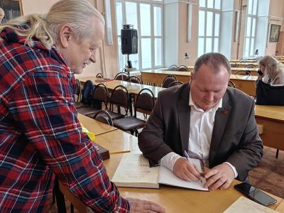 Ещё один яркий момент вечера — выступление Евгения Григорьева. Он говорил не только о книге, но и о сегодняшнем дне. Евгений поблагодарил коммунистов за то, что они не ограничиваются издательской работой. По его словам, Ивановский обком КПРФ наладил регулярную отправку гуманитарной помощи на фронт — нашим бойцам, которые сейчас сражаются за Россию.