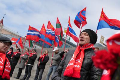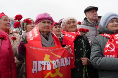Атмосфера церемонии подчеркивала преемственность поколений: сторонники левых сил подняли у постамента флаги Советских Республик.