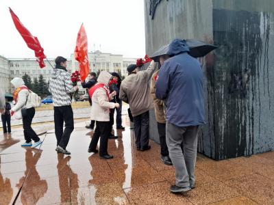 У центрального памятника вождю мирового пролетариата на площади Ленина сегодня собралось много народу, и это несмотря на ненастную погоду - ветер и дождь.
