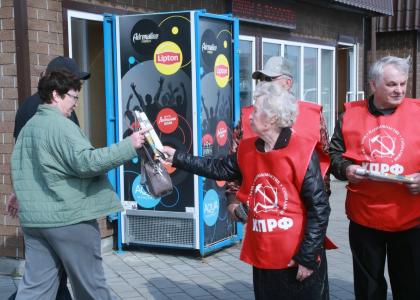 На центральные улицы Калачинска вышла команда ветеранов местного отделения КПРФ (первый секретарь А.Н. Кабакова). Цель рейда - распространение информационного бюллетеня - спецвыпуска газеты "Правда". Впрочем, только раздачей газеты опытные агитаторы не ограничиваются. Разговаривают с прохожими, разъясняют программные положения партии, которым посвящен информационный бюллетень.