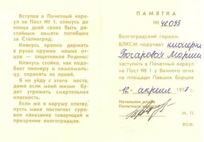 На торжественном мероприятии, посвященном 60-летию Поста №1, лидер волгоградских коммунистов отметила: «Это уникальная патриотическая работа по своей форме, и сталинградская по содержанию. Ведь именно здесь на Сталинградской земле появился первый в стране Пост №1, здесь у Вечного огня несут Вахту Памяти правнуки защитников Сталинграда-Волгограда! И я очень горжусь, что в числе этих ребят были и мои ученики: Мария Бочарова, Игорь Шадловский, Алексей Сигаев и другие.
