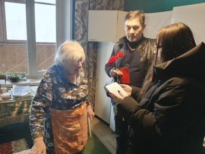 Волонтеры городского отделения «Дети войны» вручили Зинаиде Михайловне поздравление от Президента России В.В. Путина, юбилейную медаль ЦК КПРФ «80 лет Великой Победы», цветы и памятный подарок.
