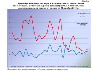 Динамический ряд, отражающий порядок изменения числа региональных сайтов, разместивших все материалы с пометкой «Срочно распространить» и полностью их игнорировавших, за период с 1 января по 24 декабря 2011 г., позволяет заключить: