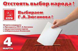 2 февраля в 11.00 в городе Москве состоится встреча кандидата в Президенты РФ Г.А. Зюганова с представителями партии КПРФ в избирательных комиссиях. Мероприятие проводится под лозунгом: «Отстоять выбор народа!». Мероприятие проводится по адресу: улица генерала Белова, д. 26. На встречу прибудут наблюдатели, члены избирательных комиссий с решающим или совещательным голосом с разных регионов России.