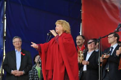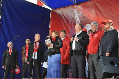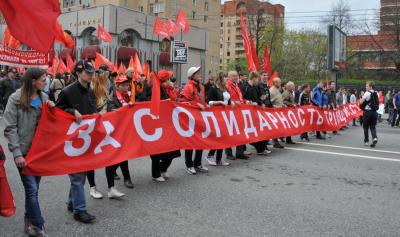 В первом ряду колонны участники шествия держат растяжку с надписью "За солидарность трудящихся".