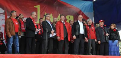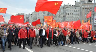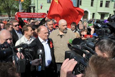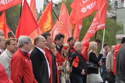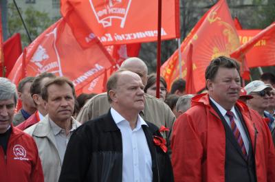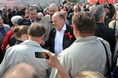 Во главе колонны коммунистов и их сторонников идут лидер КПРФ Геннадий Зюганов, первый зам председателя ЦК партии,