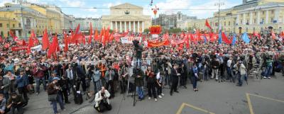 Участники демонстрации КПРФ идут от Октябрьско (Калужской) площади по улицам Большая Полянка и Большая Якиманка,