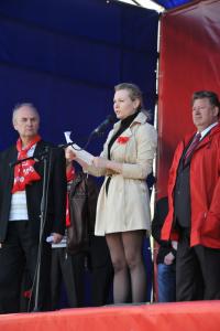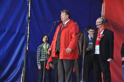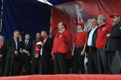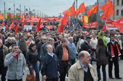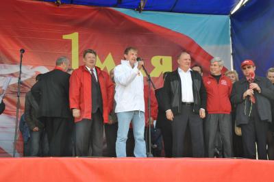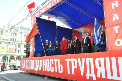 Как и было запланировано, демонстранты прошли от Октябрьской площади до Театрального проезда к 12.30. Напротив Большого театра, у памятника Карлу Марксу была установлена небольшая сцена, с которой выспупили лидер КПРФ, представители организаций и движений, принявших участие в шествии.