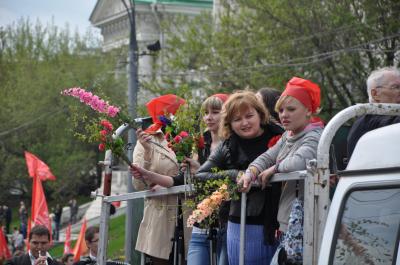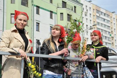 Перед участниками шествия едет автомобиль с символикой КПРФ, который везет девушек с цветами в красных платках.
