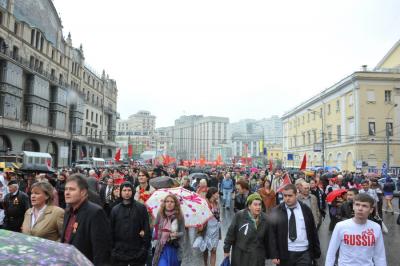 Несмотря на проливной дождь, колонна под красными флагами прошла от Пушкинской до Лубянской площади столицы, где состоялся митинг. Основной лозунг акции: «Власть – народу-победителю!»