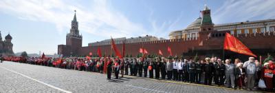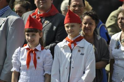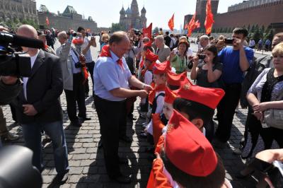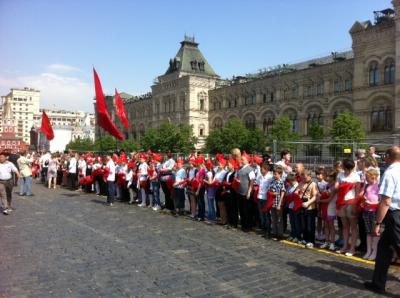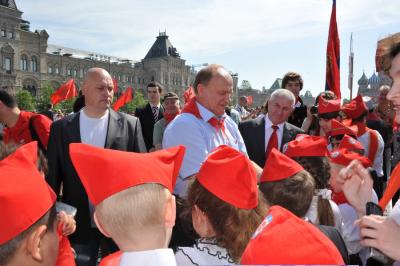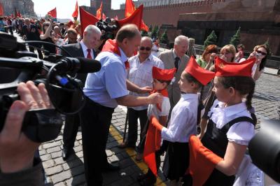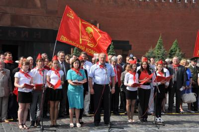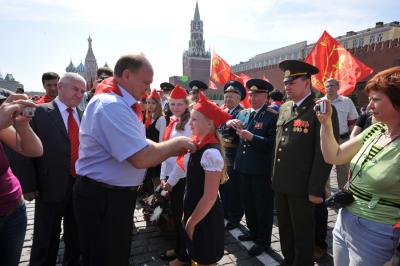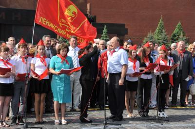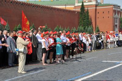 …Под барабанную дробь вносится пионерское знамя, звучит пионерское приветствие. Зачитывается текст торжественного обещания, которое повторяет вся площадь. Затем почетные гости во главе с Г.А. Зюгановым повязывают галстуки юным пионерам. Среди тех, кто пришел сегодня на Красную площадь, руководители ЦК КПРФ, коммунисты и комсомольцы, ветераны, активисты пионерского движения всех поколений.