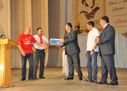 Затем наступило время награждения. Заместитель Председателя ЦК КПРФ В.И. Кашин вручил награды победителям конкурса молодежных агитбригад, состоявшегося накануне. Первое место заняли активисты из Волгоградской области, на втором – представители Карачаево-Черкессии, на третьем – Ставропольского края. Награды были также вручены победителям детского литературного конкурса, приуроченного к Пушкинским дням в Осетии. Был награжден и ряд журналистов, чью профессиональную деятельность отличают честность и объективность.