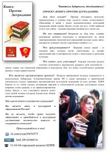 Очень хотелось бы обратиться к коммунистам различных регионов с предложением поддержать почин хабаровчан. Как показывает опыт, провести «Книгу против деградации» возможно малыми ресурсами. Для этого требуется трое - пятеро человек, книги и доступ к социальным сетям. Эффект же от акции получается значительным и позволяет донести людей, и главным образом до молодежи, образ КПРФ как партии, которая борется за доступность достижений мировой и отечественной культуры для всех граждан и олицетворяет собой противодействие валу деградации, который захлестнул нашу страну.