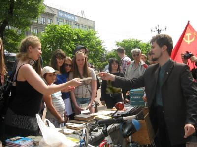 Затем все участники акции приступили к выбору книг, число которых стало заметно таять и к концу акции практически иссякло. «Откуда у вас столько книг? Где вы их берете?» - недоумевали участники акции и случайные прохожие, привлеченные столь необычным зрелищем. К сожалению, в наше время для того, чтобы найти книгу, не нужно ходить в книжный магазин или библиотеку – зачастую достаточно бывает заглянуть на близлежащую помойку или выйти на лестничную клетку своего подъезда. В первую очередь именно эти книги попадают в поле зрения молодых коммунистов и комсомольцев. Их собирают в горкоме партии, приводят в порядок (подклеивают или восстанавливают страницы, реставрируют переплет) и в дальнейшем они попадают на акцию. Среди находок иногда попадаются интересные во всех отношениях экземпляры – например, книга знаменитого дальневосточного писателя и краеведа Всеволода Сысоева с дарственной надписью автора. Или же первые советские издания сочинений классиков марксизма – 1920-х-начала 1930-х годов.