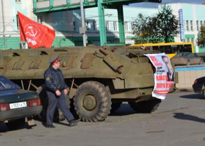 Уж очень необычно бронетранспортер смотрелся на стоянке в ряду легковушек. Особую лихость боевой машине придавал развевающийся красный флаг КПРФ. И уж совсем законченный вид боевой машине придавал плакат с красноречивым лозунгом «Власть пора менять!».