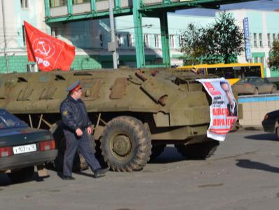 Уж очень необычно бронетранспортер смотрелся на стоянке в ряду легковушек. Особую лихость боевой машине придавал развевающийся красный флаг КПРФ. И уж совсем законченный вид боевой машине придавал плакат с красноречивым лозунгом «Власть пора менять!».