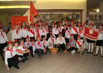 Конференцию пришли приветствовать тепло встреченные залом пионеры Дивногорска. От имени делегатов П. П. Медведев вручил им корзину фруктов.