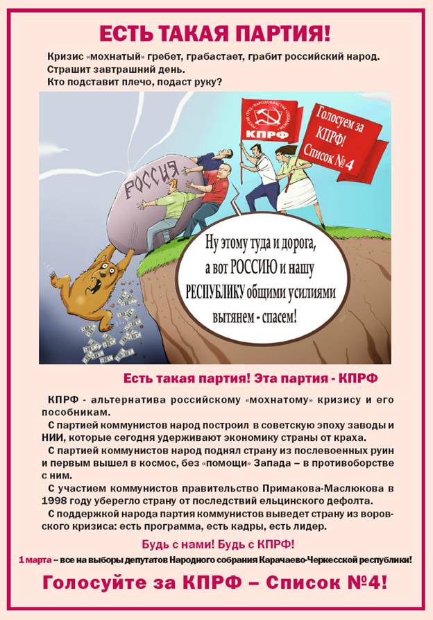 Кризис «мохнатый» гребет, грабастает, грабит российский народ. Страшит завтрашний день. Кто подставит плечо, подаст руку?Есть такая партия! Эта партия - КПРФ!КПРФ - альтернатива российскому «мохнатому» кризису и его пособникам.Публикуем в порядке обмена опытом образец агитационной листовки Карачаево-Черкесского Республиканского отделения КПРФ