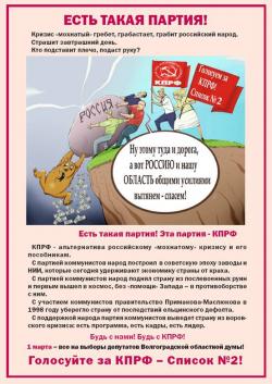 Кризис «мохнатый» гребет, грабастает, грабит российский народ. Страшит завтрашний день. Кто подставит плечо, подаст руку?Есть такая партия! Эта партия - КПРФ!КПРФ - альтернатива российскому «мохнатому» кризису и его пособникам.Публикуем в порядке обмена опытом образец агитационной листовки Волгоградского областного отделения КПРФ