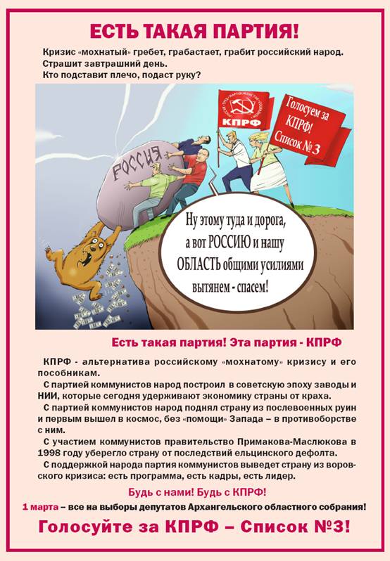 Кризис «мохнатый» гребет, грабастает, грабит российский народ. Страшит завтрашний день. Кто подставит плечо, подаст руку?Есть такая партия! Эта партия - КПРФ!КПРФ - альтернатива российскому «мохнатому» кризису и его пособникам.Публикуем в порядке обмена опытом образец агитационной листовки Архангельского областного отделения КПРФ