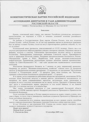 12 сентября 2009 г. в Ростовском обкоме КПРФ состоялось заседание Ассоциации депутатов и глав Администраций поселений Ростовской области избранных от КПРФ. В соответствии с повесткой дня был заслушан доклад главы Администрации Приморского сельского поселения Неклиновского района Ростовской области Пищерковой В.В. «О формировании доходов бюджета Приморского сельского поселения Неклиновского района на 2009 г. и на плановый период 2010 и 2011 гг. ».