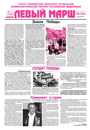 4 мая ульяновские читатели получили очередной, 8-й (230-й), номер газеты областной организации КПРФ «Левый марш». Он открывается материалами, посвященными празднованию Дня Победы. Ветераны фронта и тыла рассказывают о великой эпопее, которая отмечена героическими подвигами простых советских людей, вставших на защиту Родины. Газета пишет о Знамени Победы - одном из священных символов советской истории, об отпоре, который дали коммунисты «единороссам» и их приспешникам, пытавшимся опоганить знамя. Копия Знамени Победы, пишет газета, широко используется в мероприятиях, проводимых КПРФ, комсомольской и пионерской организациями.
