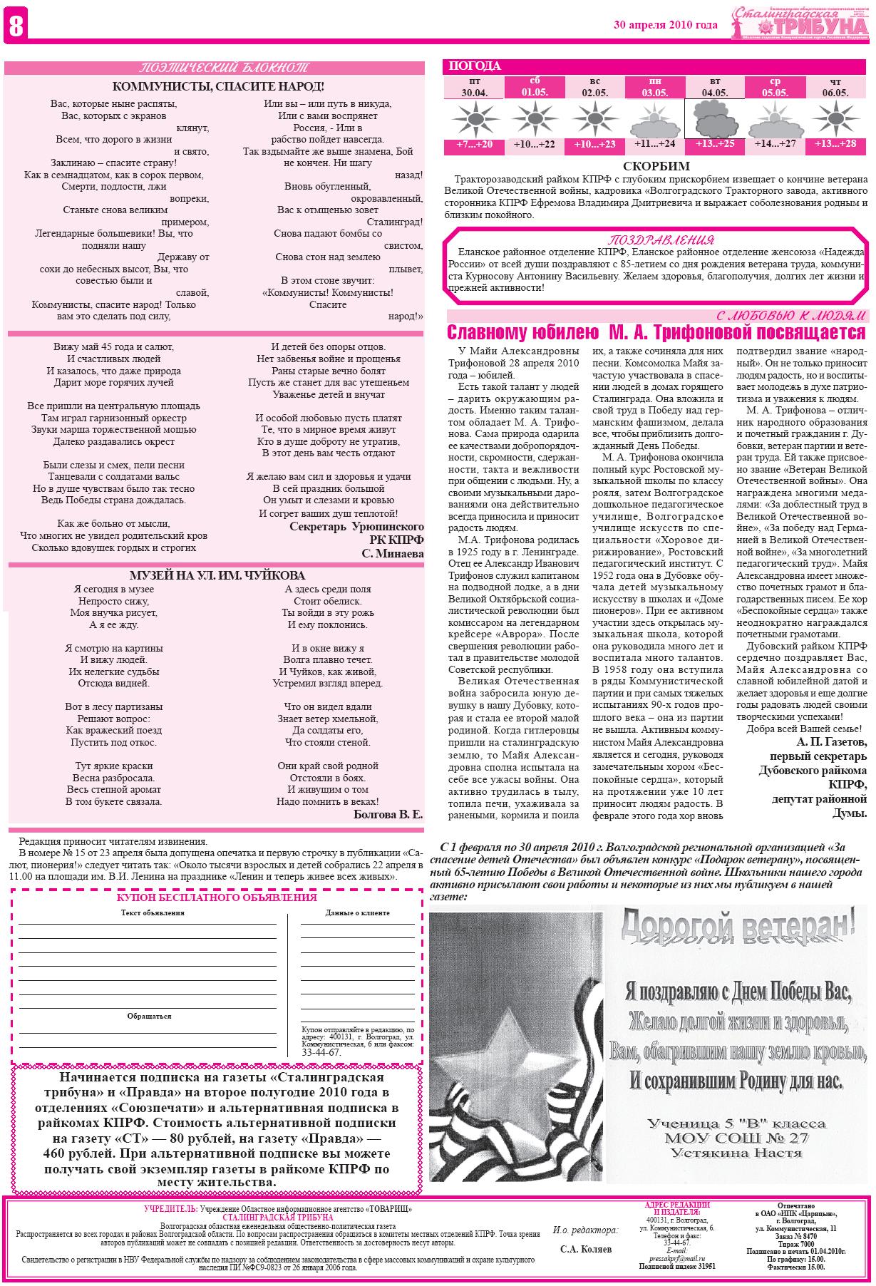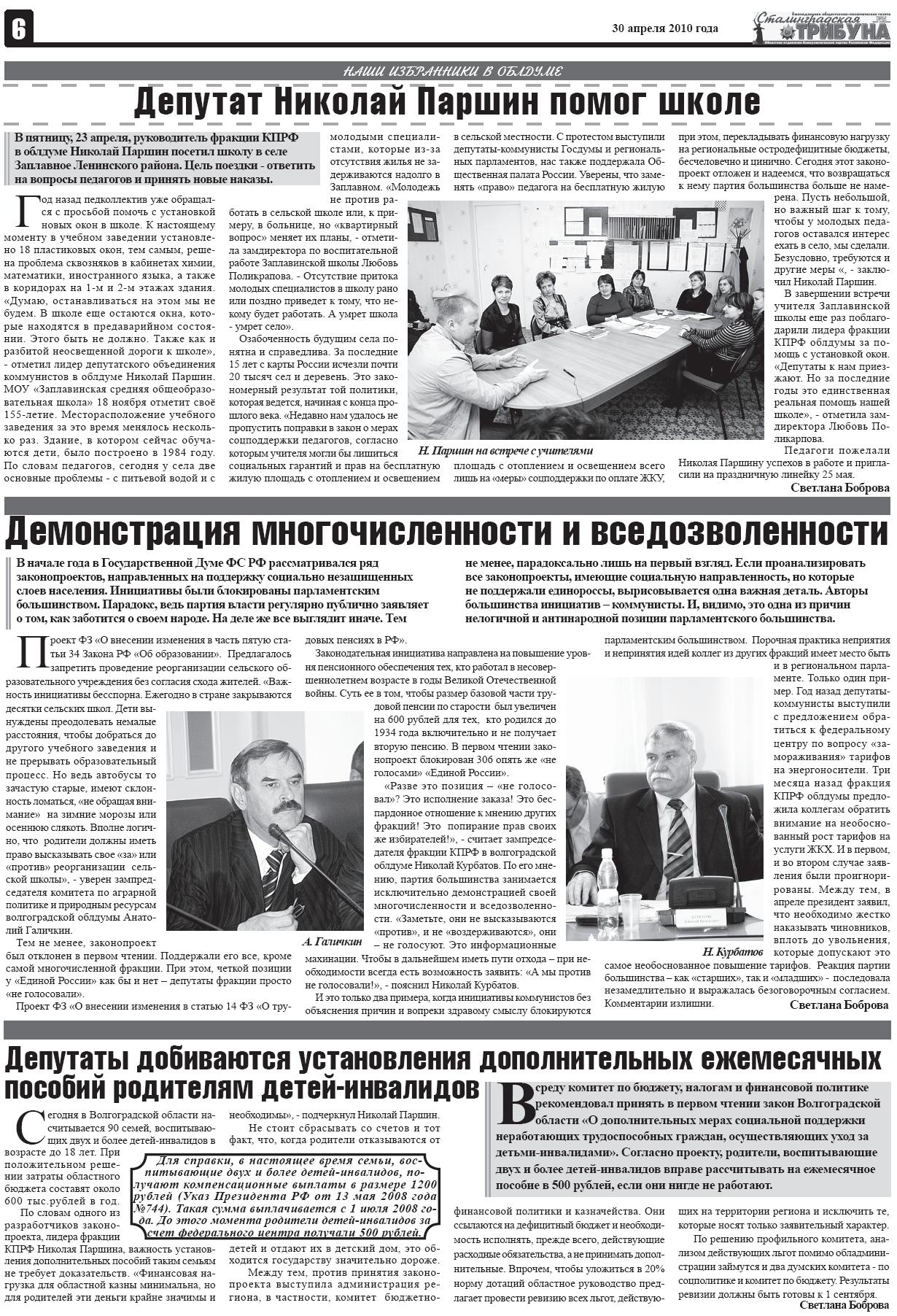 На второй полосе газеты наш корреспондент Мансура Зеленская расскажет вам об интересном опыте работы коммунистов Светлоярского района, а на шестой странице Светлана Боброва в своих статьях поведает о том, как депутат Николай Паршин встретился с учителями Ленинского района и как защищают права детей-инвалидов депутаты-коммунисты в Волгоградской областной Думе.