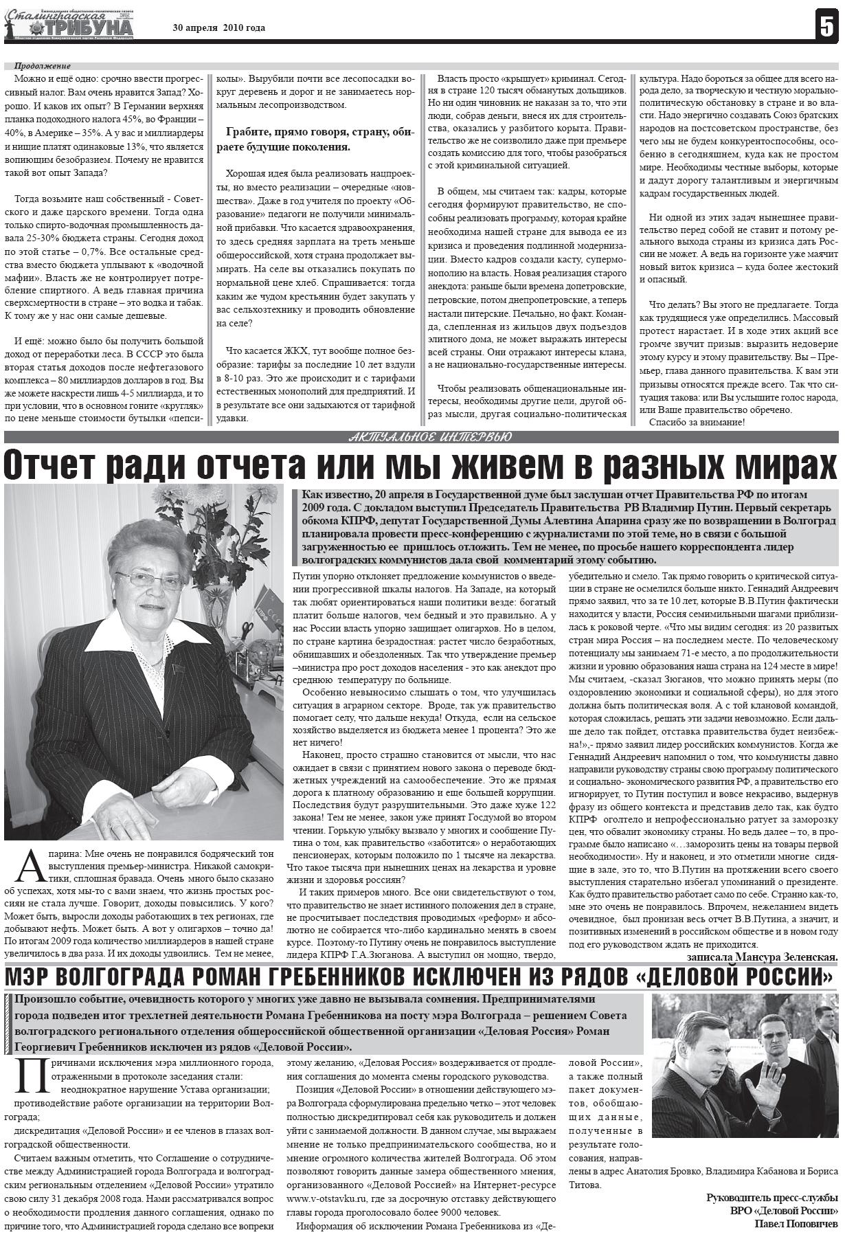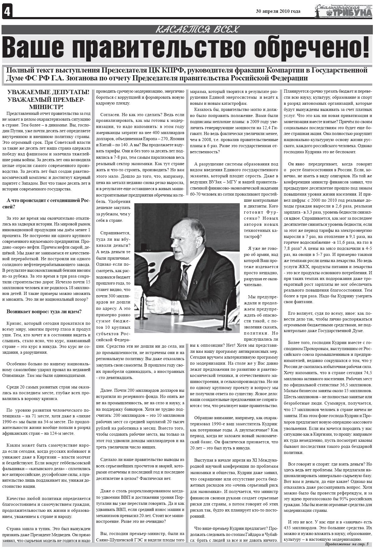 Кроме того, вместо телепрограммы на 4-й и 5-й полосе, вы найдете актуальное интервью лидера волгоградских коммунистов А. В. Апариной об отчете Председателя правительства и выступление Г. А. Зюганова «Ваше правительство обречено!»