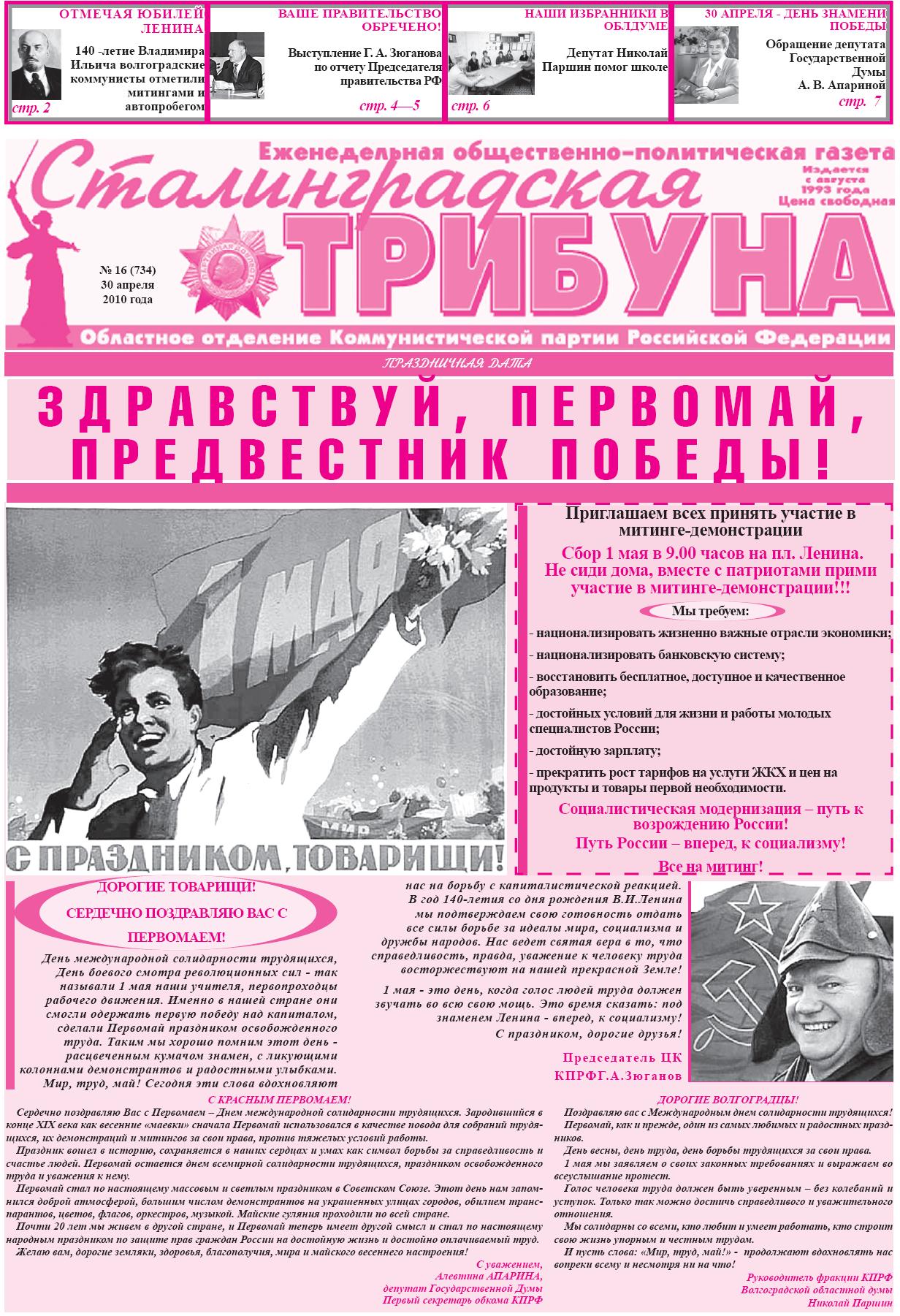 В этом номере вы сможете узнать о том, как волгоградские коммунисты встретили 140-летие Владимира Ильича Ленина.