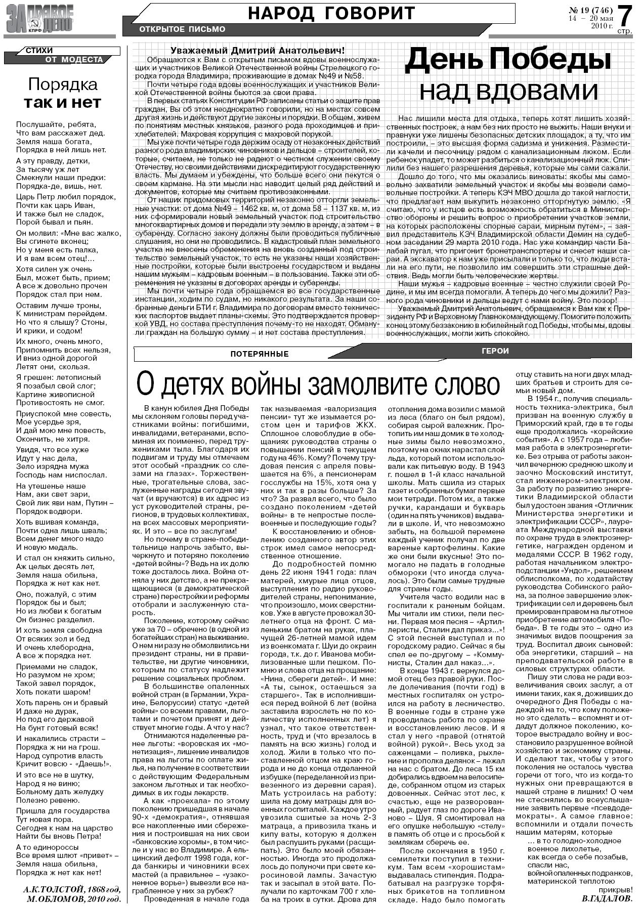 Вышел из печати очередной номер газеты Владимирского регионального отделения КПРФ «За правое дело» (№ 19 (746), 14 – 20 мая 2010 г.).