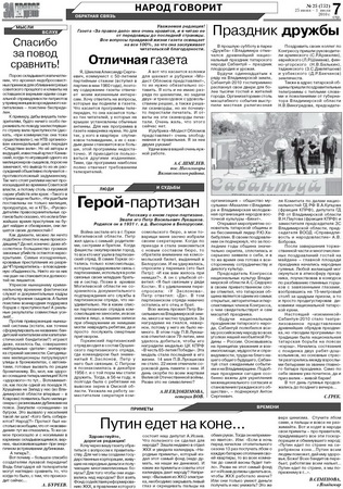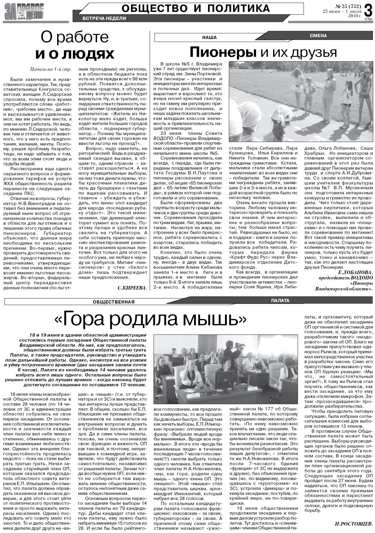 Газета рассказывает о заседании политического консультативного совета при губернаторе Владимирской области, главной темой которого была борьба с безработицей. На заседании говорилось о необходимости сохранять и развивать рабочие места, помогать бизнесу, отмечалось, что во Владимирской области это вопросы решаются лучше, чем во всех других российских регионах. Большая статья посвящена работе областной общественной палаты, она подвергнута острой критике за то, что вместо своих прямых обязанностей занялась внутренними склоками, дрязгами и подковерной борьбой.