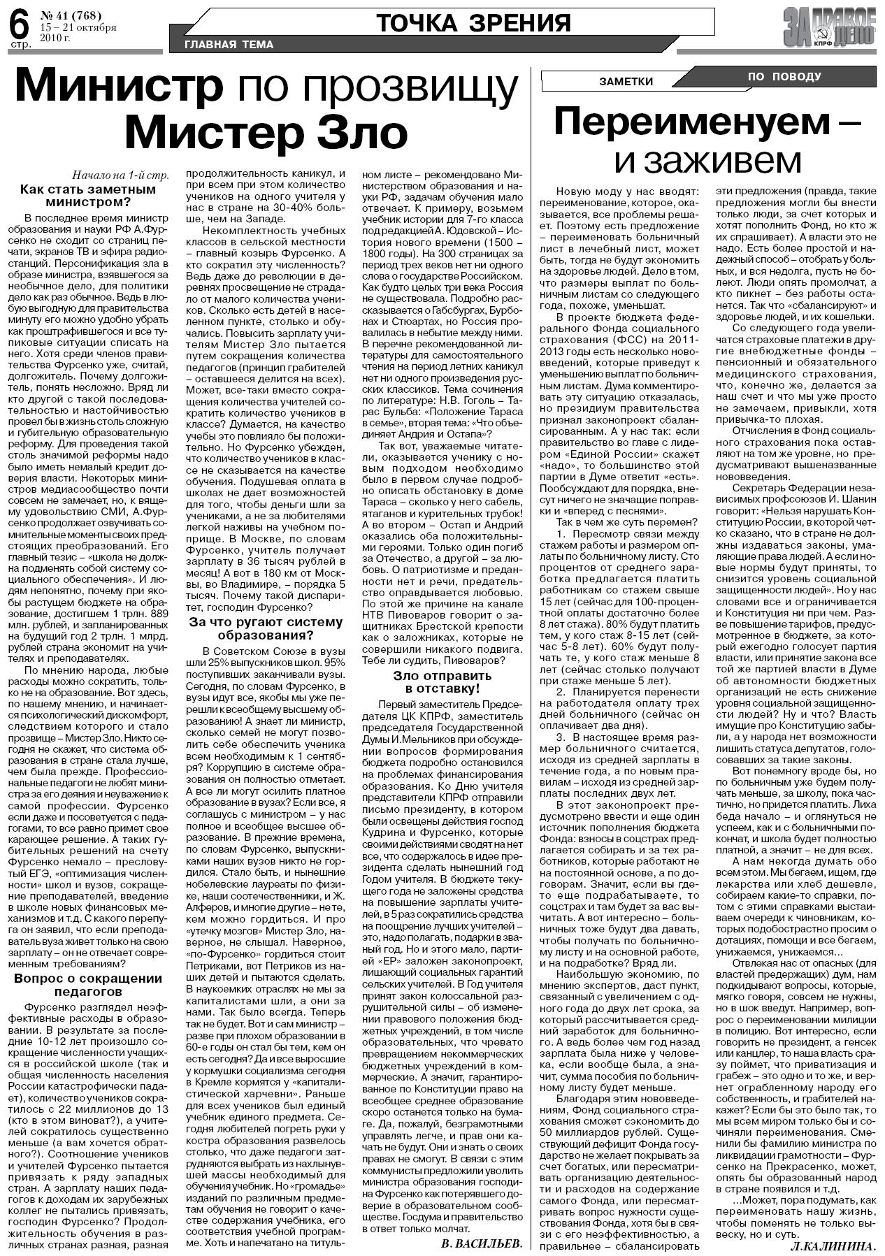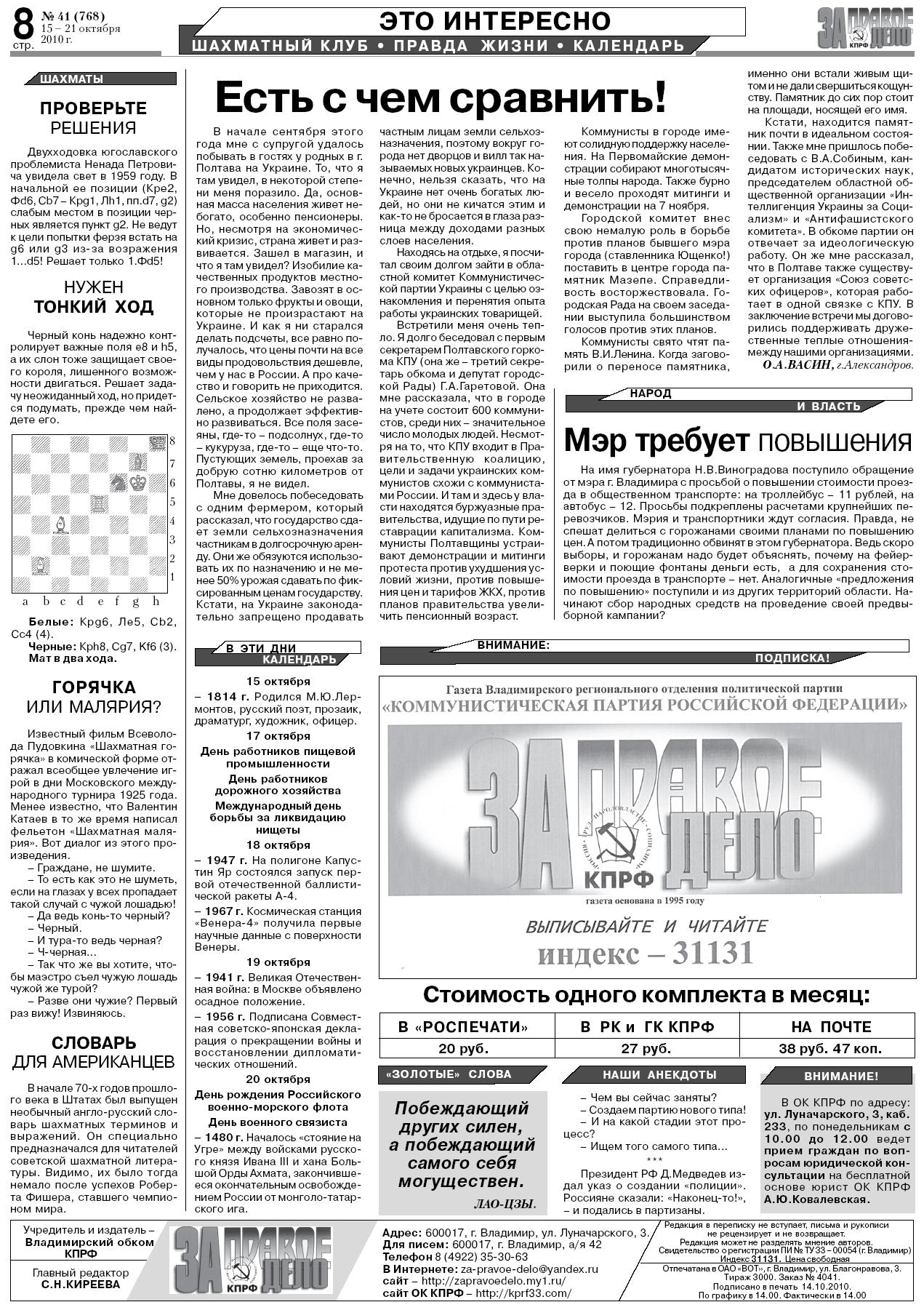 В нем опубликованы информационные и аналитические материалы, посвященные актуальным вопросам жизни области и страны. Рассказывая о едином дне голосования 10 октября, когда в области проходили дополнительные выборы в Законодательное собрание, газета отмечает, что к урнам пришли лишь 20,59% избирателей. Она комментирует слова едроссовского руководителя Б.Грызлова: «Раз нас выбирают, значит, то, что мы делаем, нравится народу». И процент поддержки в этот раз якобы выше. Это как считать. 4 года назад на выборы приходило минимум 30% населения, сегодня – чуть больше 20%. Из тех, кто пришел, основную массу составили солдаты срочной службы, представители различных администраций и бюджетных организаций, загнанные на участки под разными страхами. Причем, например, в ковровском голосовании из 57% «победителя» почти 50% – голоса солдат. По стране реальные цифры – двукратная потеря голосов «ЕР».