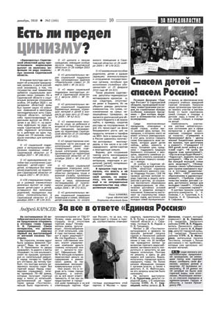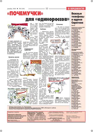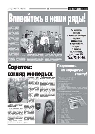 Под заголовком «КПРФ не по пути с «Единой Россией» опубликованы отчеты депутатов Саратовской городской думы. Разоблачаются незаконные действия мэрии города, которые осуществляются под прикрытием «единоросской» думы. Газета пишет об обострении городских проблем в связи с начавшейся приватизацией Саратова. Депутат Госдумы Валерий Рашкин рассказывает о результатах работы с обращениями граждан. Вниманию читателей предлагается много других материалов, посвященных проблемам области, различным сторонам экономической и политической жизни.