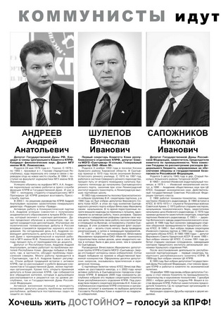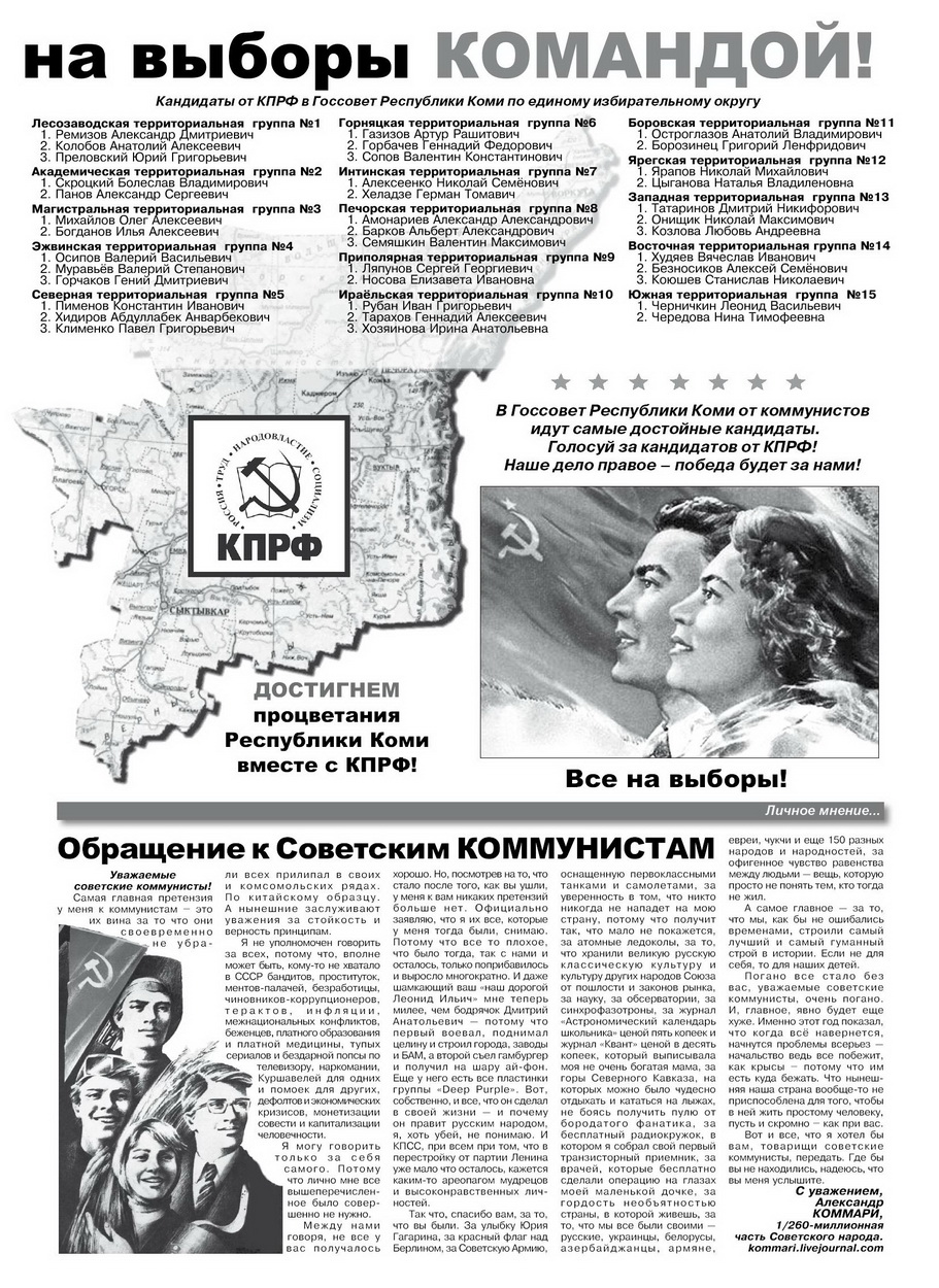 В нем опубликованы материалы, посвященные предстоящим 13 марта выборам депутатов Госсовета республики и представительных органов местного самоуправления. На первой полосе – перечень основных требований, которые выдвигают коммунисты, защищая интересы трудящихся. «Коммунисты идут на выборы командой!» - под таким заголовком помещен список кандидатов от КПРФ в Госсовет Республики Коми по единому избирательному округу. Кандидаты представлены в 15 территориальных группах, во главе списка – депутаты Госдумы РФ Андреев Андрей Анатольевич, Шулепов Вячеслав Иванович и Сапожников Николай Иванович.