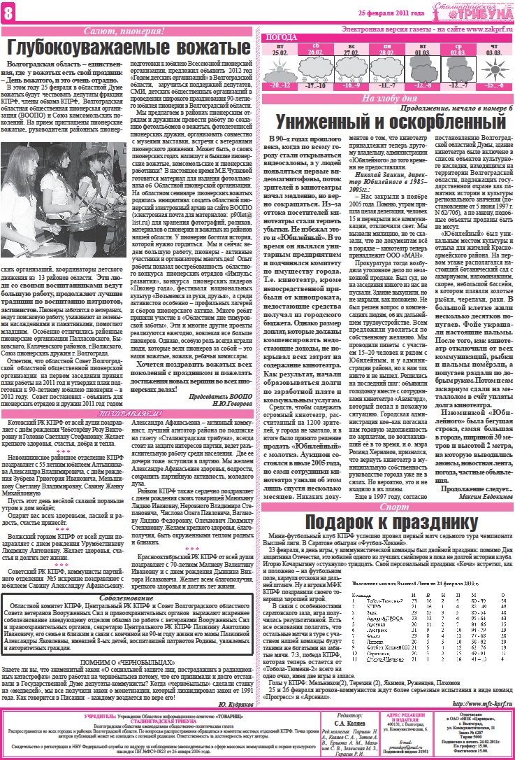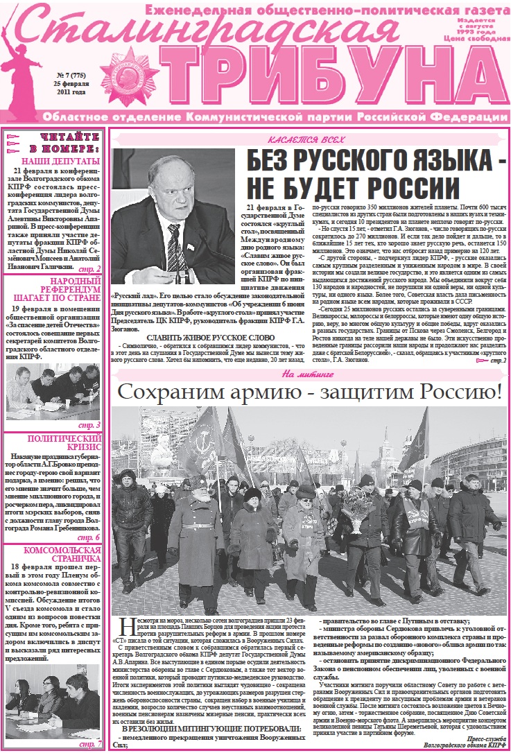 Несмотря на мороз, несколько сотен волгоградцев пришли 23 февраля на площадь Павших Борцов для проведения акции протеста против разрушительных реформ в армии. О том, что потребовали митингующие от путинско-медведевского руководства страны, вы узнаете на первой полосе.