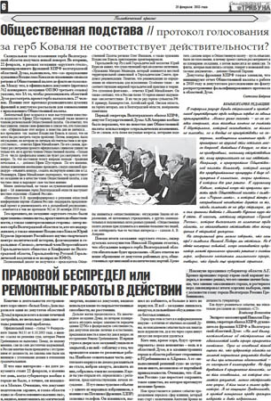 Не смолкает и тема изменения герба Волгоградской области. Во вторник, 22 февраля, в рамках заседания «круглого стола», инициированного фракцией КПРФ волгоградской областной Думы, выяснилось, что «за» предложение художника Владислава Коваля по изменению символа региона в Общественной палате де-факто не голосовали… Все подробности скандальной темы, получившей новый поворот, вы узнаете из статьи «Общественная подстава // протокол голосования за герб Коваля не соответствует действительности?»