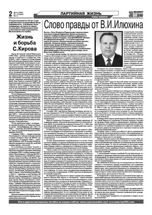 Она публикует материалы, посвященные памяти недавно ушедшего из жизни Виктора Ивановича Илюхина. Большая статья рассказывает о Сергее Мироновиче Кирове, легендарном соратнике Ленина и Сталина, 125-летие которого отмечается в эти дни. И совсем скоро – 50-летие первого полета в космос героя всей планеты Юрия Алексеевича Гагарина – о нем тоже обширная публикация.