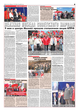 9 мая в центре Москвы прошла стотысячная акция КПРФ. 9 мая около 100 тысяч человек вышли на Тверскую улицу, Охотный ряд, Театральную и Лубянскую площади, чтобы принять участие в шествии и митинге, организованных КПРФ и Всероссийским штабом протестным действий. День Победы - праздник поистине всенародный. И на демонстрацию, которую проводят коммунисты в центре Москвы, выходит, как правило, очень много людей...