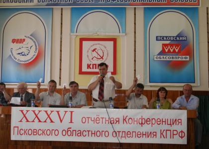 В Пскове 9 июля 2011 года состоялась XXXYI(внеочередная) отчетная Конференция Псковского областного отделения КПРФ. С отчетным докладом о работе обкома КПРФ по выполнению решений XXXV отчётно-выборной Конференции Псковского областного отделения КПРФ в период с июля 2010 по июнь 2011 годавыступил первый секретарь обкома Никитин В.С. Делегаты конференции также заслушали доклад председателя КРК областного отделения Проскурина С.П. После обсуждения докладов Конференция приняла постановление и признала работу обкома КПРФ за отчетный период удовлетворительной.