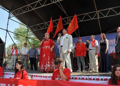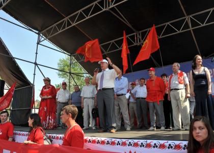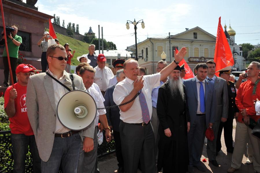 «Под знаменем Минина и Пожарского, знаменем Великого Октября и красного знамени Победы вперед за построение единой, социалистической России», - обратился к народным ополченцам Геннадий Зюганов.