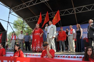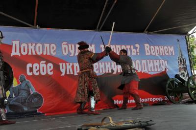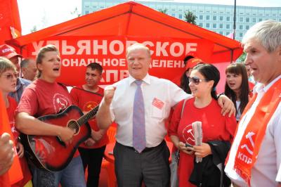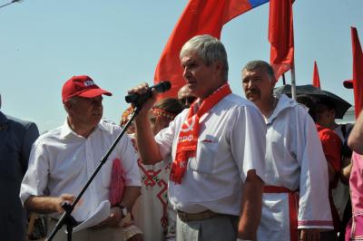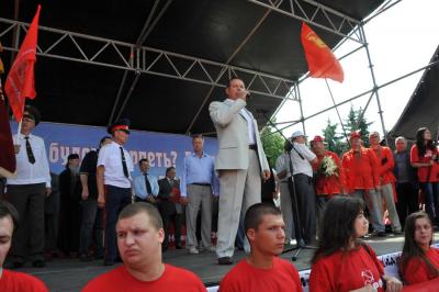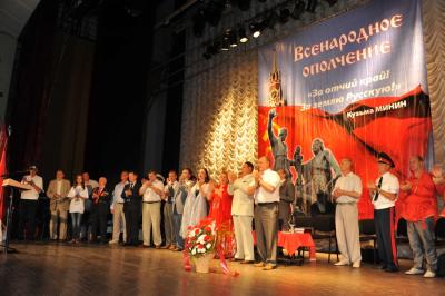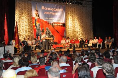 «Под знаменем Минина и Пожарского, знаменем Великого Октября и красного знамени Победы вперед за построение единой, социалистической России», - обратился к народным ополченцам Геннадий Зюганов.