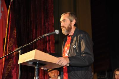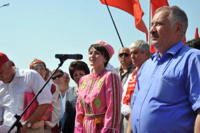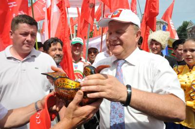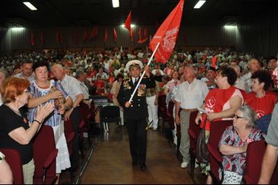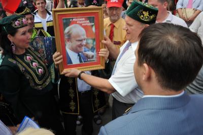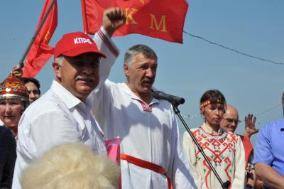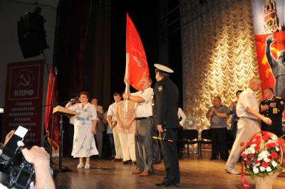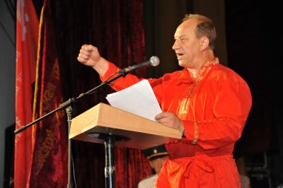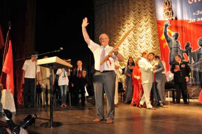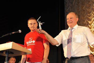 Лидеру российских коммунистов Г.А. Зюганову вручили знамя Народного ополчения имени Минина и Пожарского и освященный меч. Завершилось мероприятие исполнением песни из известного художественного фильма «Александр Невский» - «Вставайте, люди русские!».